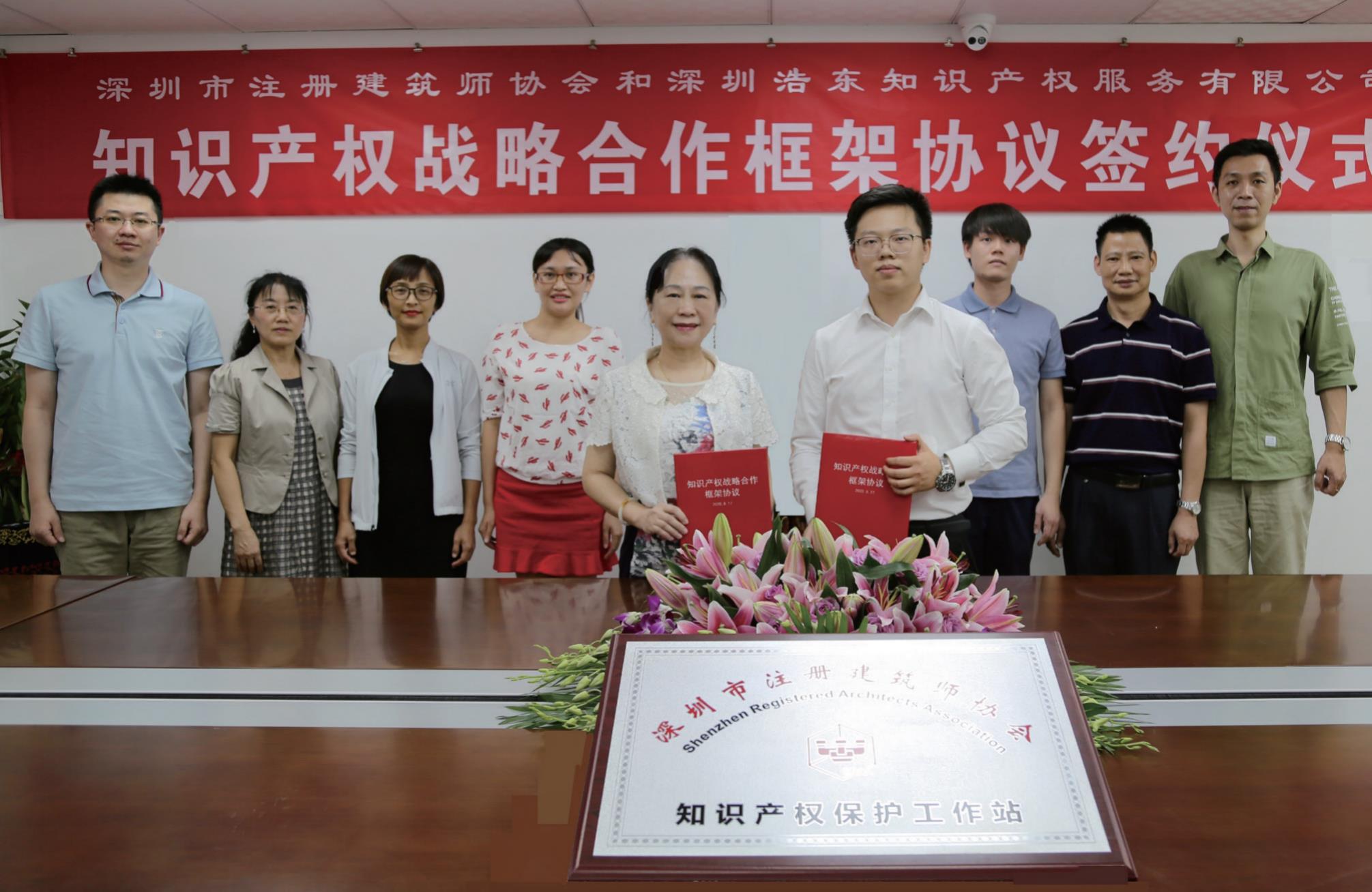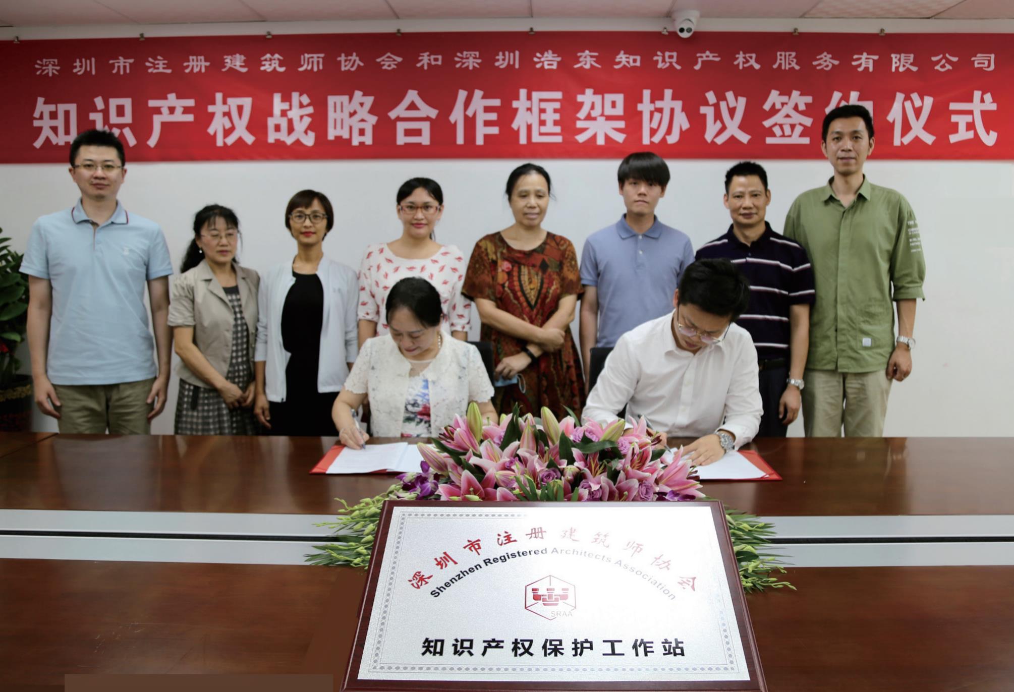 2020年8月17日下午,在深圳市市场监督局(深圳市知识产权局)的指导下,深圳市注册建筑师协会知识产权工作站揭牌仪式暨战略合作会议,在深圳市福田区设计大厦1503会议室成功举行。张一莉执行会长兼秘书长与浩东服务有限公司梁杰总经理签订了“知识产权战略合作框架协议”,该协议的签署标志着双方正式建立了知识产权战略合作伙伴关系。随后,进行了工作站成立大会及揭牌仪式。